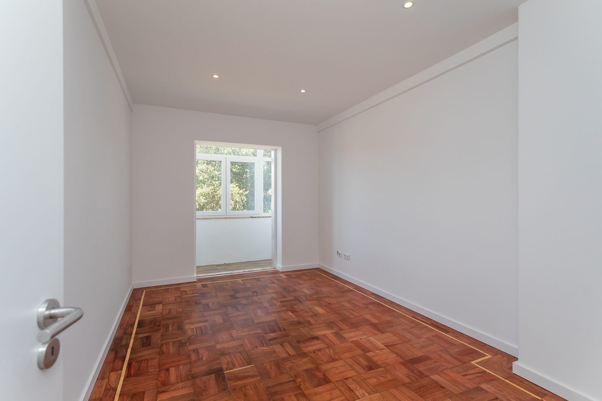 Renovação com Estilo: O apartamento foi totalmente renovado, com foco na luminosidade e na harmonia dos materiais. O hall e o corredor apresentam roupeiros embutidos e portas brancas, criando um contraste elegante com o clássico pavimento em taco de madeira natural.