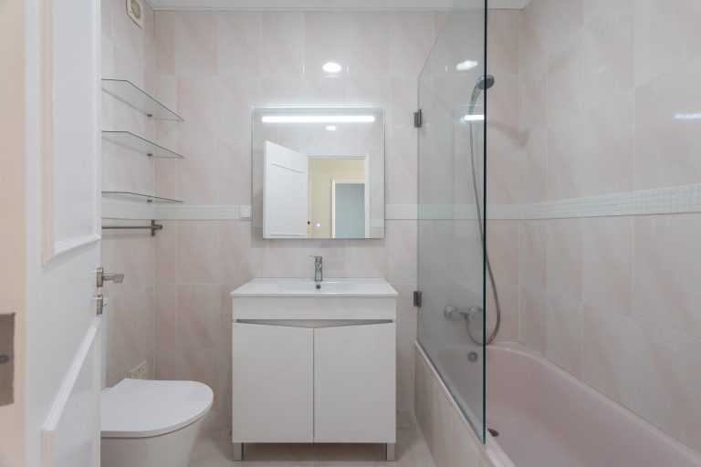 A casa de banho foi totalmente remodelada, com materiais atuais e uma estética limpa, alinhada com o restante apartamento.