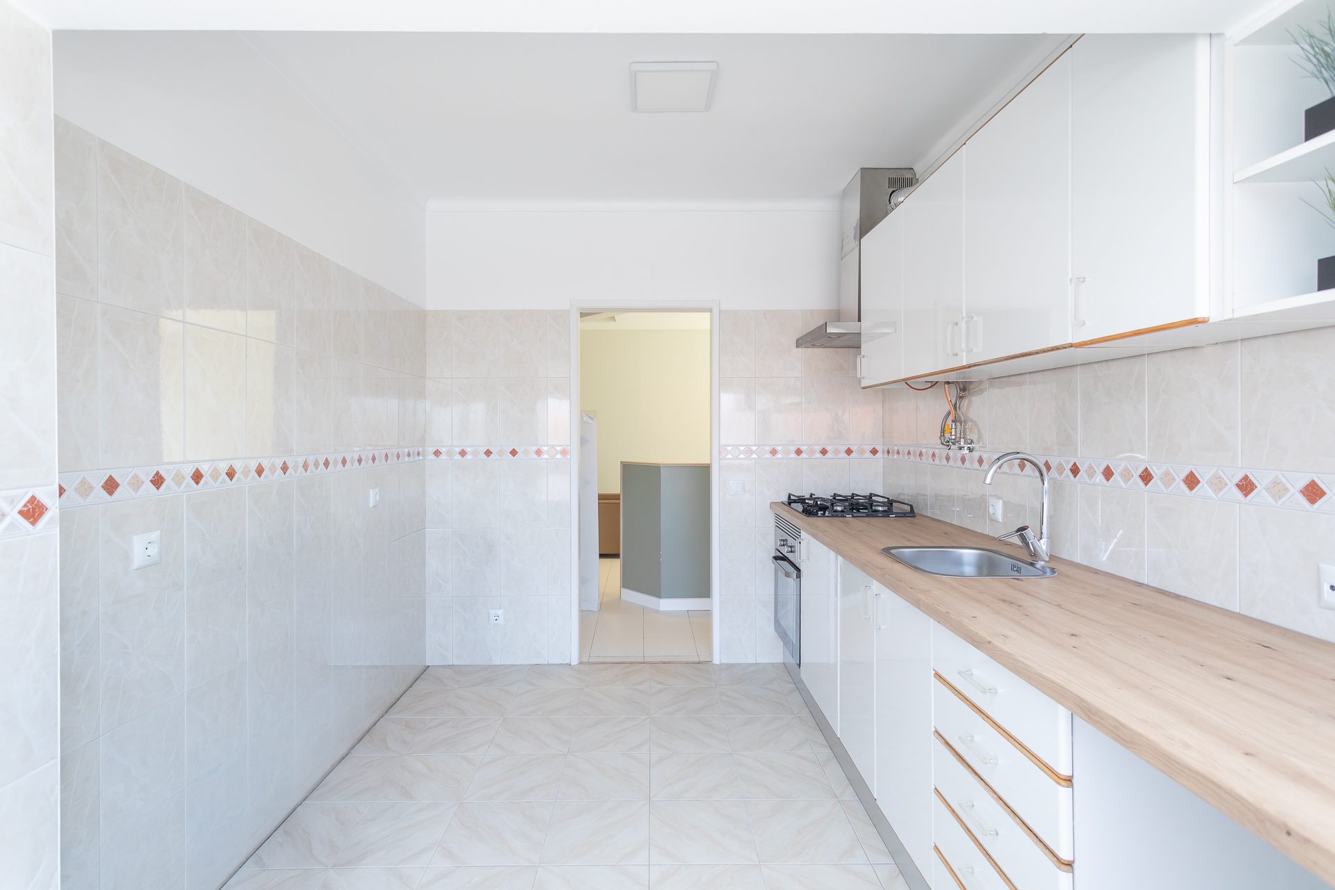A cozinha, de linhas contemporâneas, combina tons de cinza e madeira, oferecendo arrumação eficiente e um espaço prático para o dia a dia. A sala e os quartos mantêm uma atmosfera equilibrada, com pavimentos em madeira que acrescentam conforto térmico e uma sensação de continuidade.