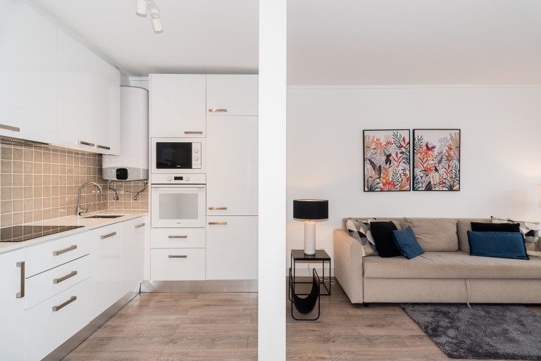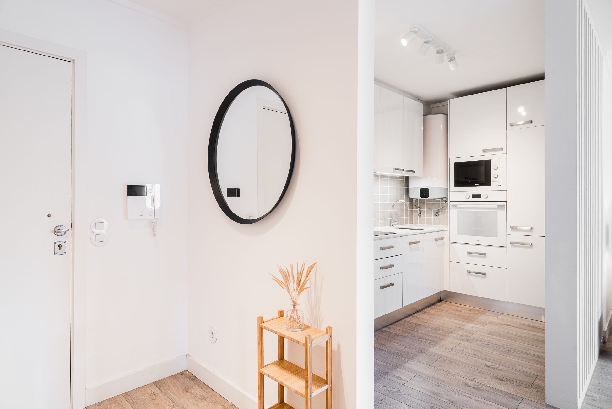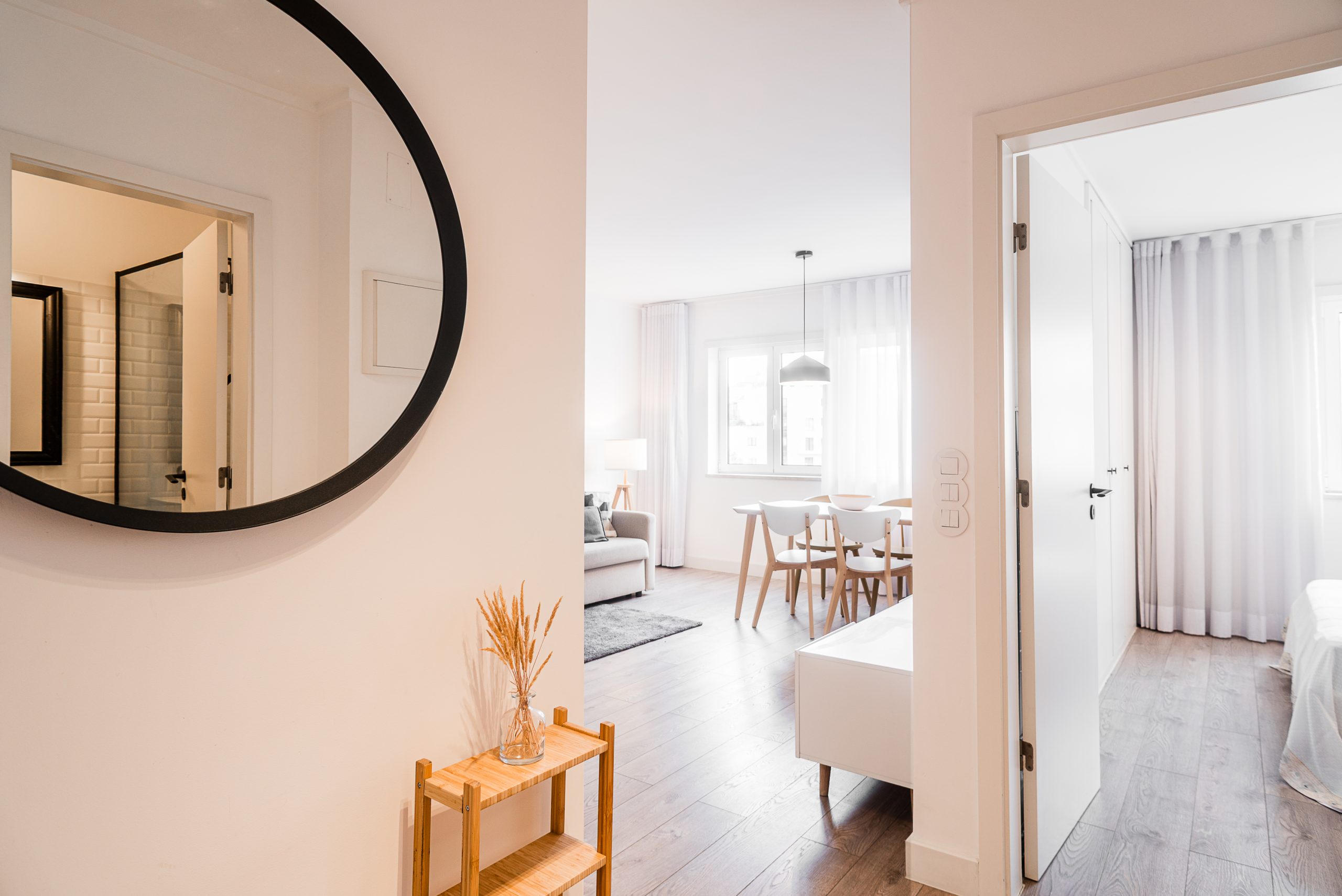 Wooden flooring throughout the apartment, adding warmth and elegance