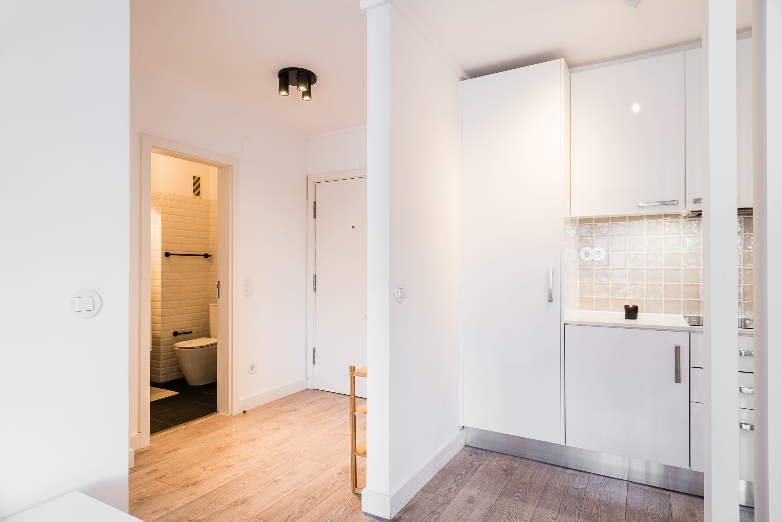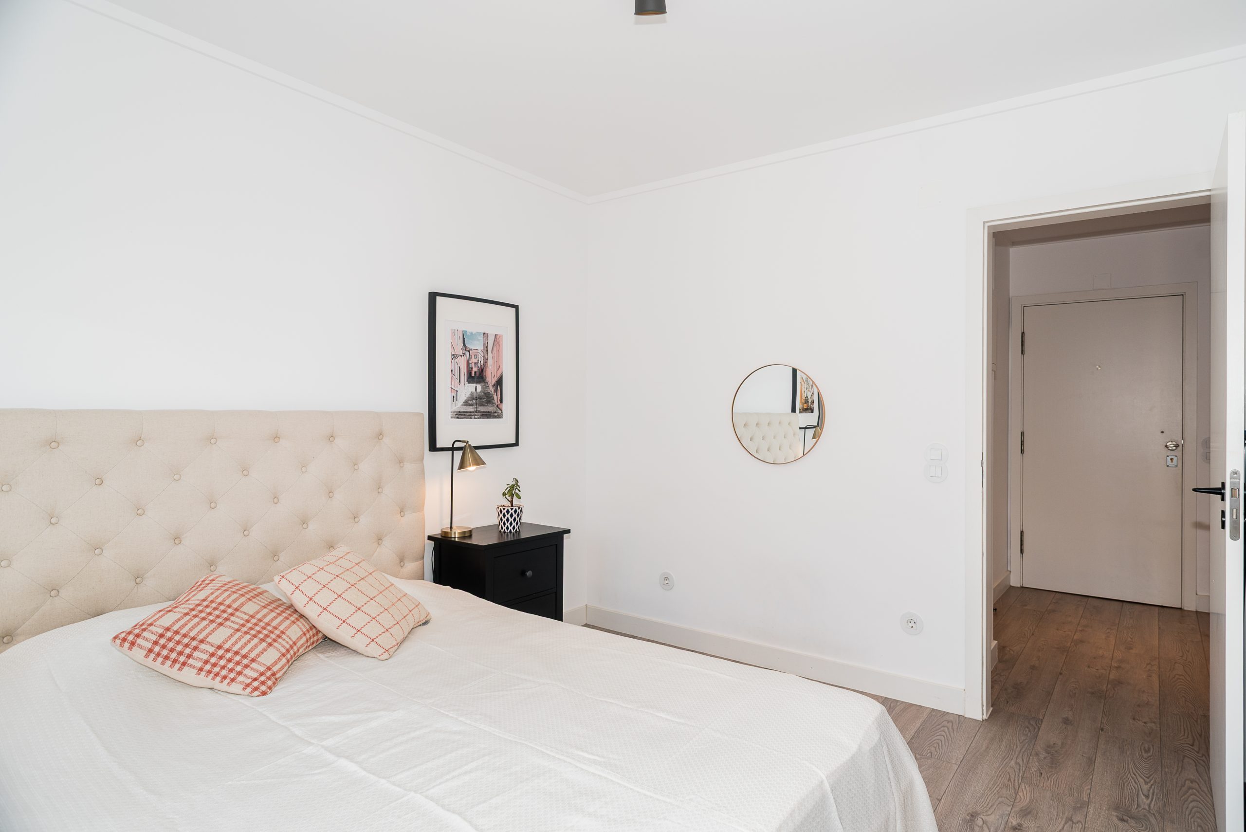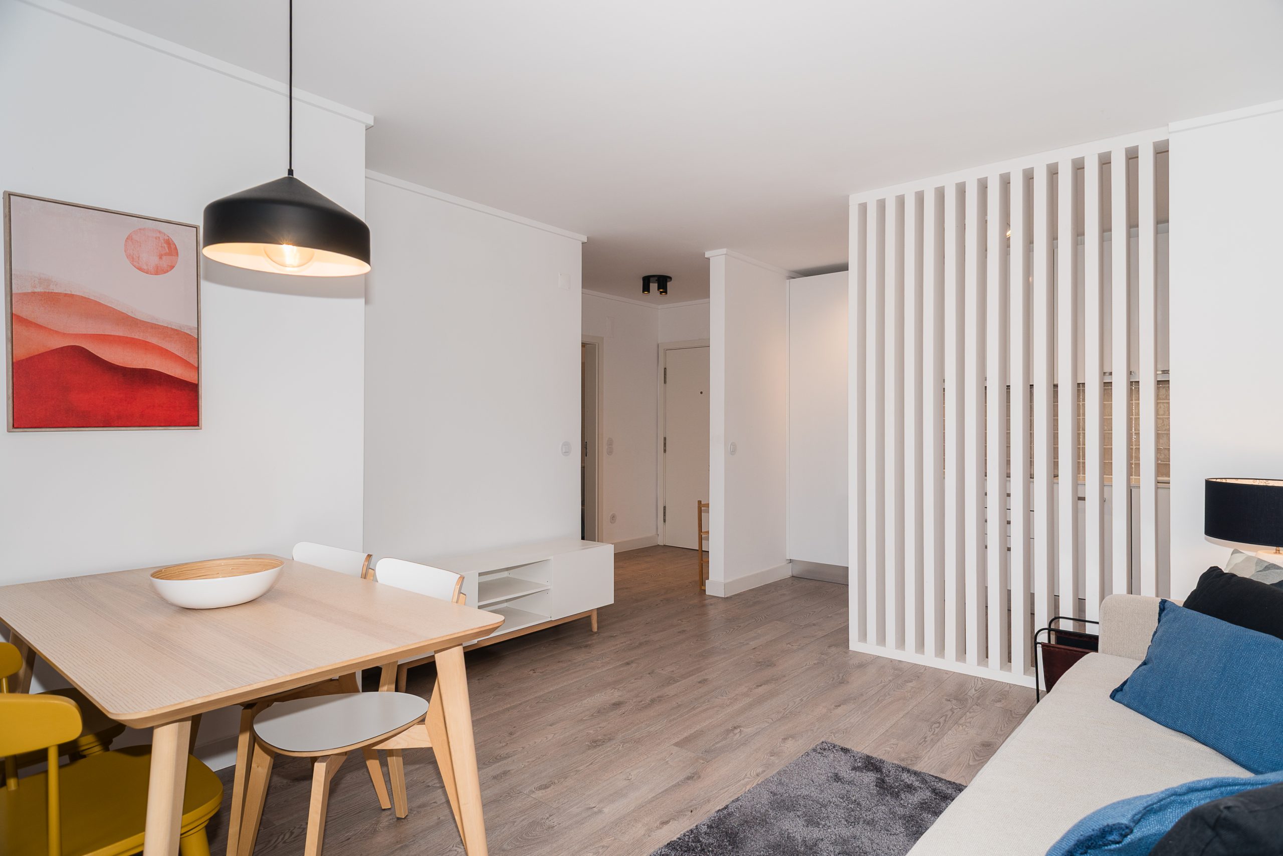 Wooden flooring throughout the apartment, adding warmth and elegance