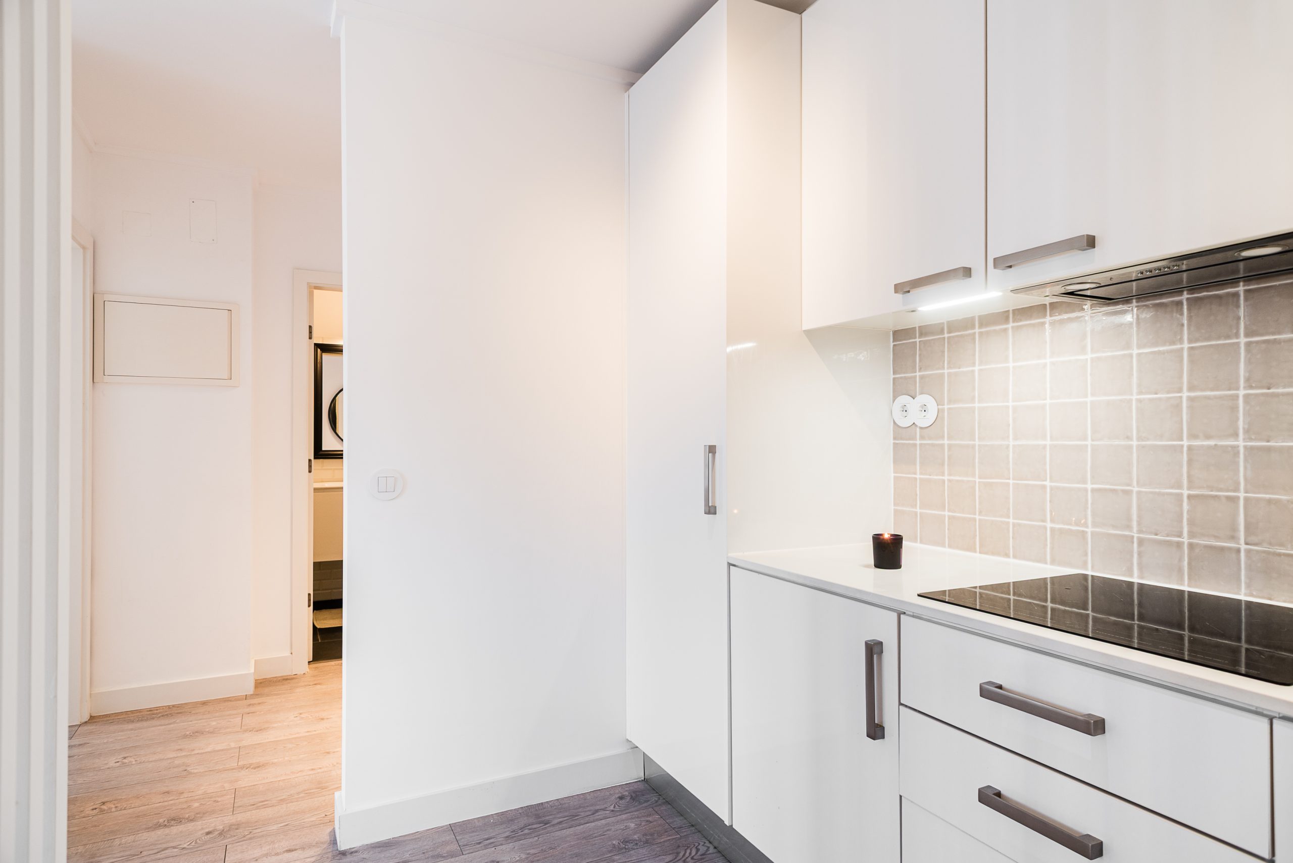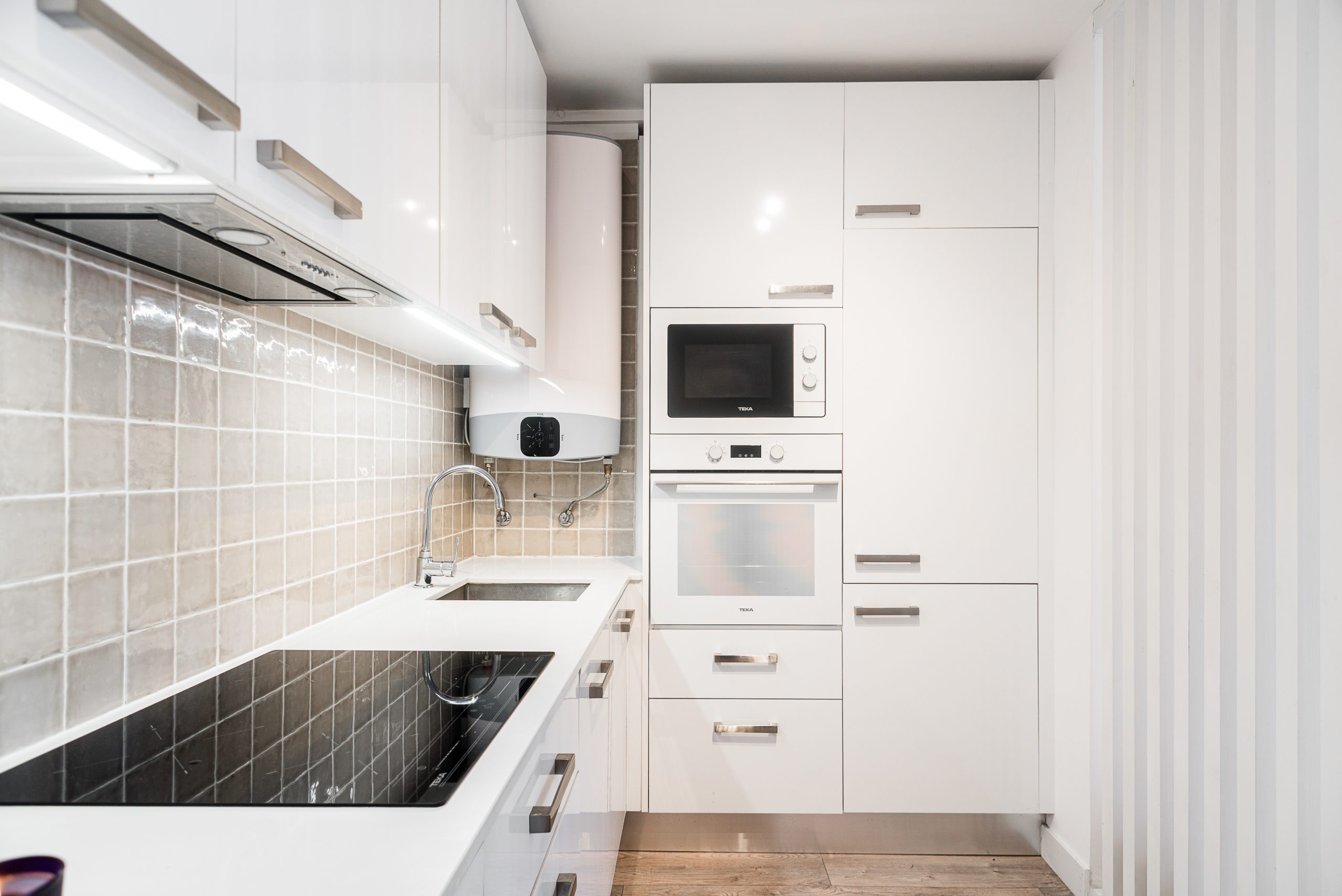 Minimalist design kitchen, in white tones, fully equipped with built-in appliances and pantry