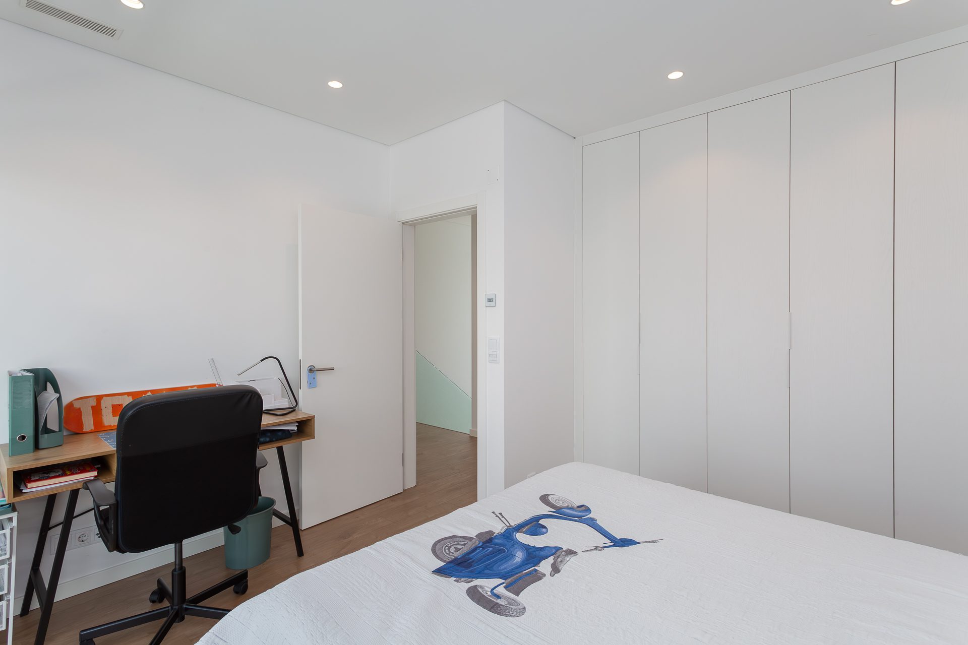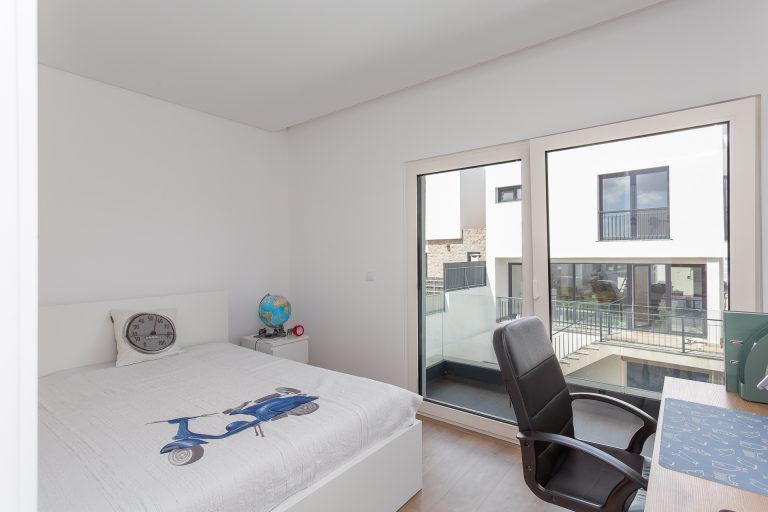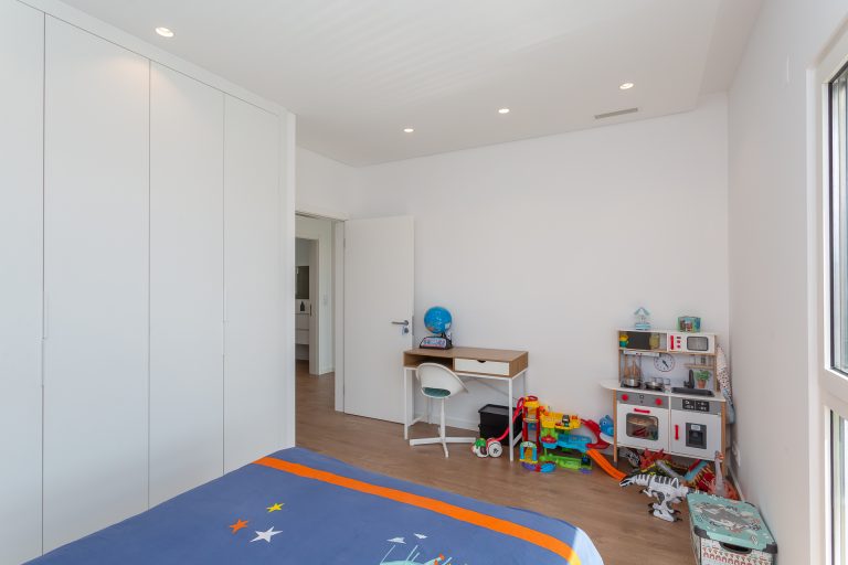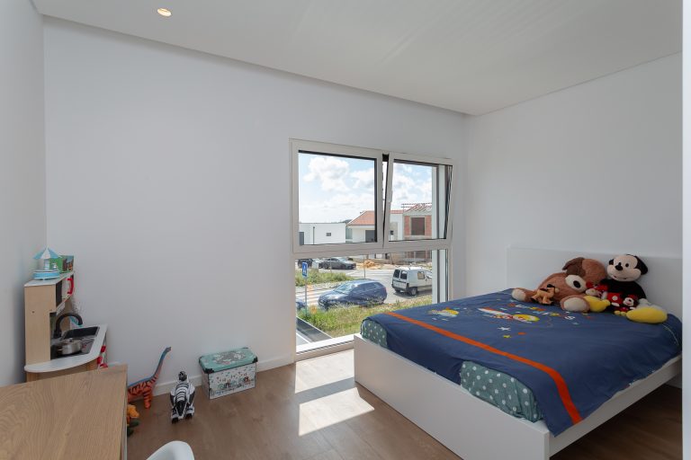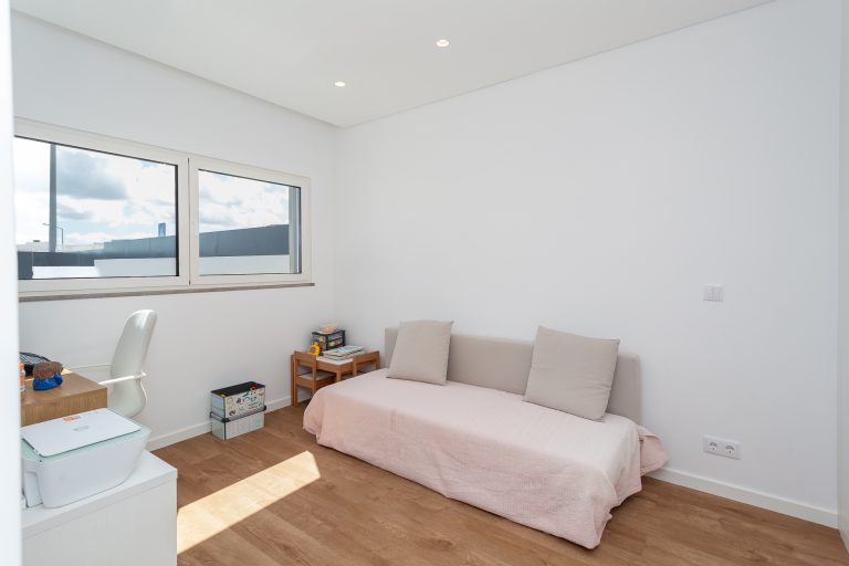 No piso superior, a zona privada é composta por três quartos. A suíte principal oferece conforto acrescido, com closet, casa de banho privativa e total privacidade. Os dois quartos adicionais, espaçosos e luminosos, partilham uma casa de banho moderna. Todos contam com roupeiros embutidos, janelas amplas e acabamentos de elevada qualidade.
