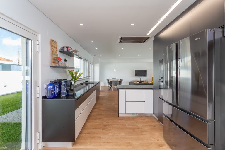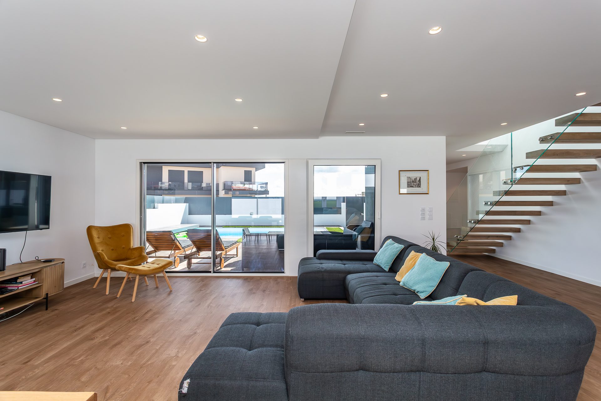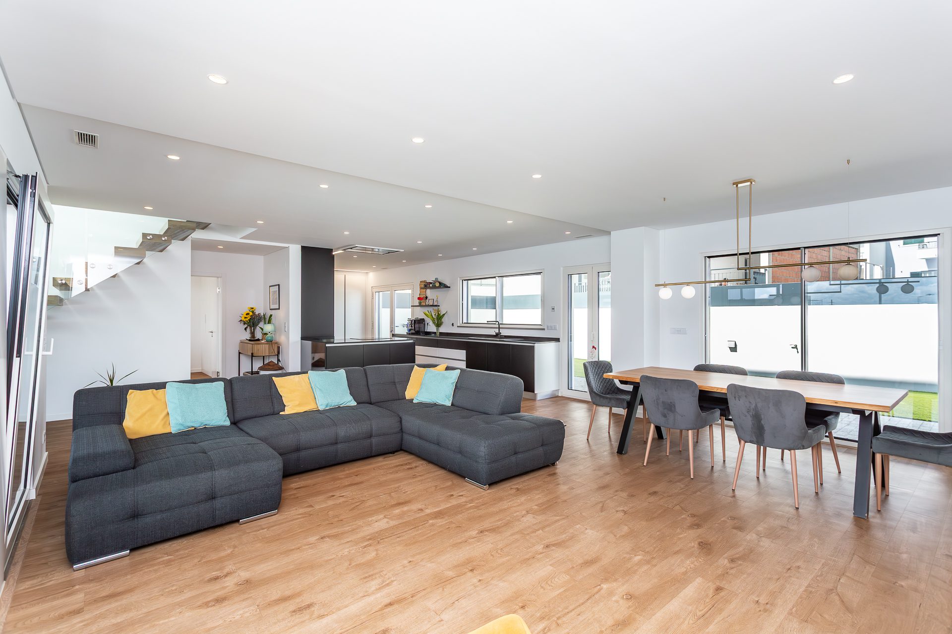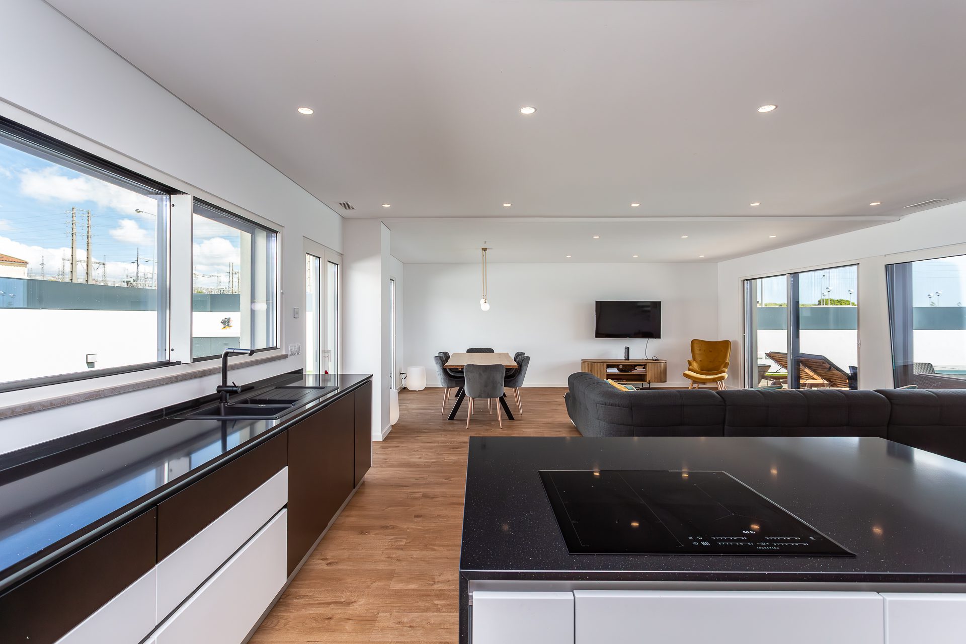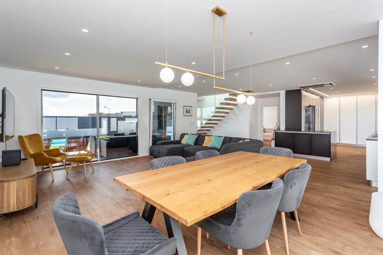 No rés-do-chão, um hall acolhedor dá acesso a uma ampla sala em open space com áreas bem definidas para estar e jantar. A luz natural entra generosamente pelas grandes janelas, que fazem a ligação direta ao terraço e à piscina. A cozinha, totalmente equipada com eletrodomésticos topo de gama, destaca-se pela funcionalidade e pelo design discreto e elegante.