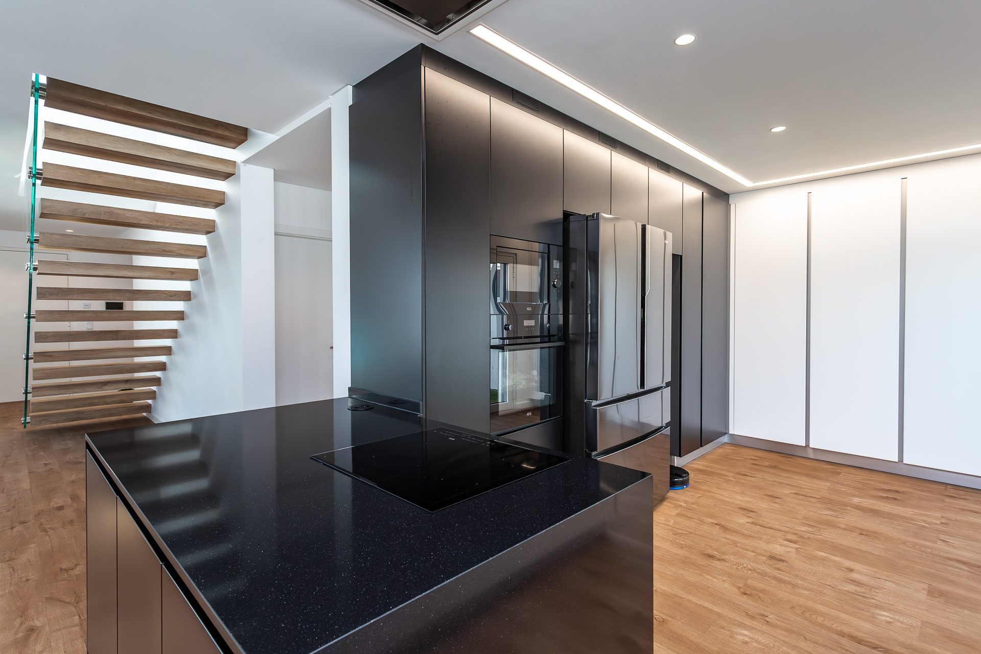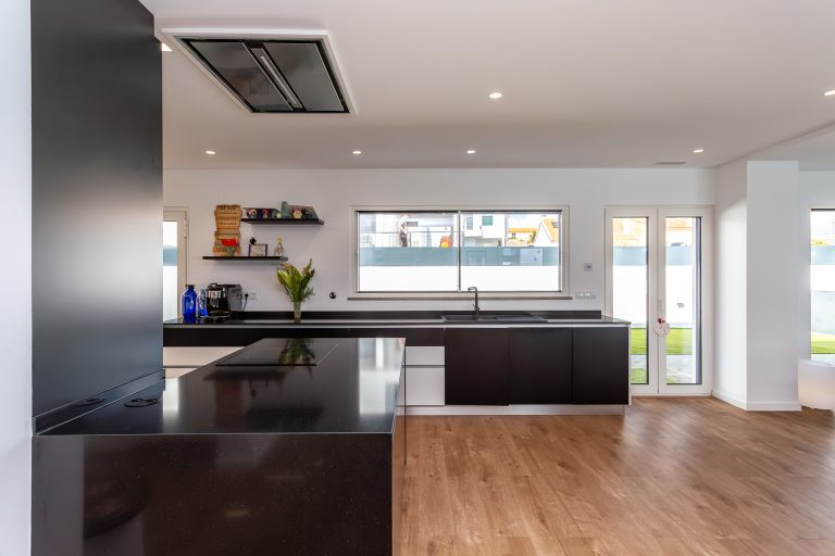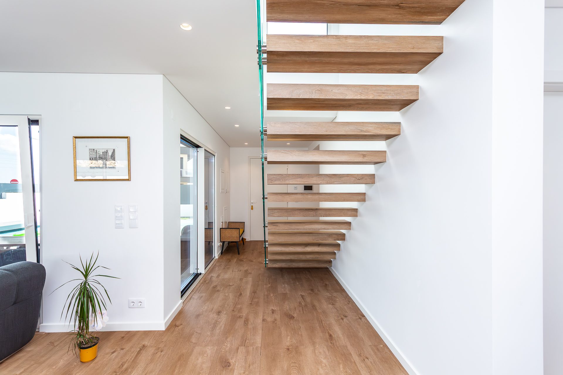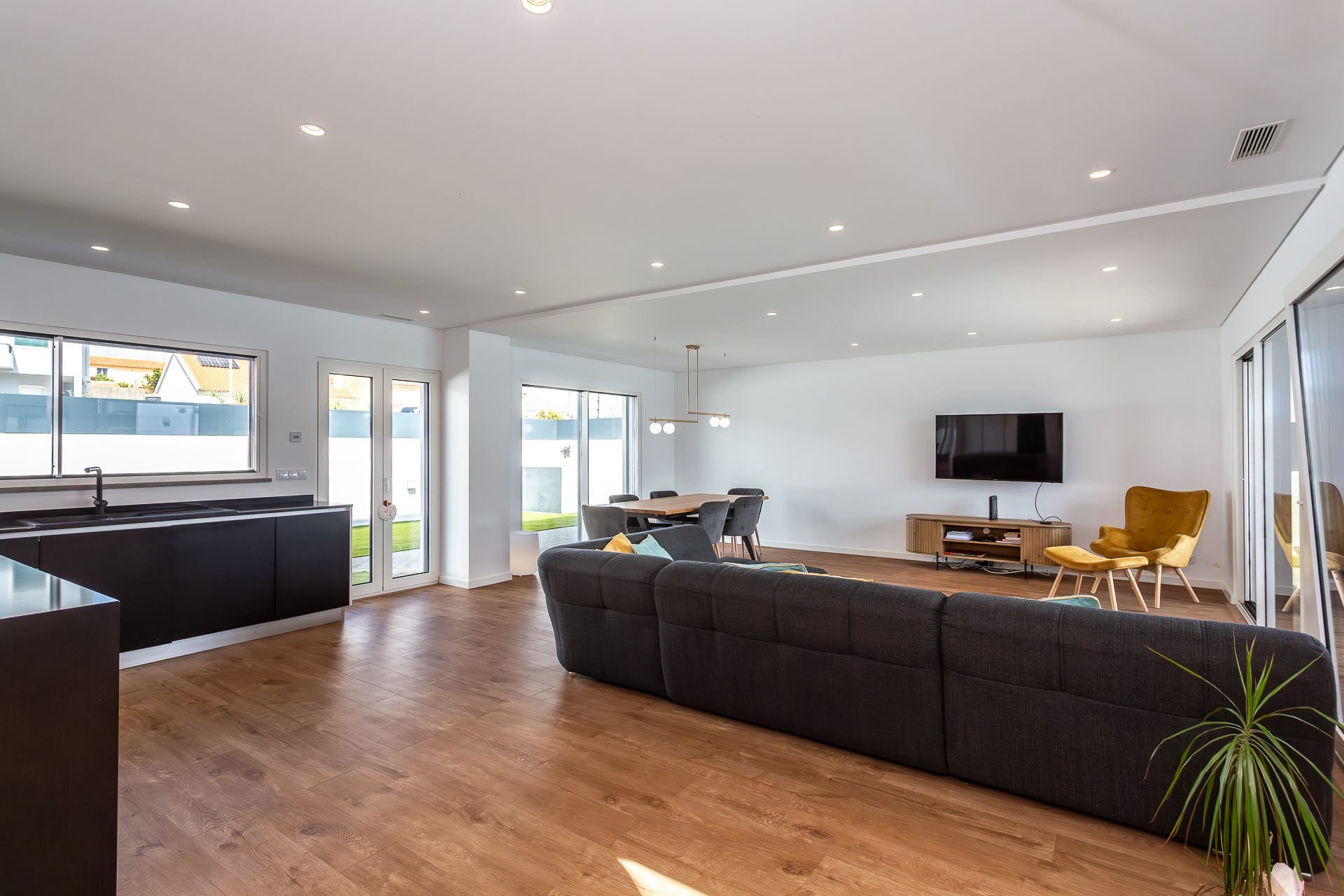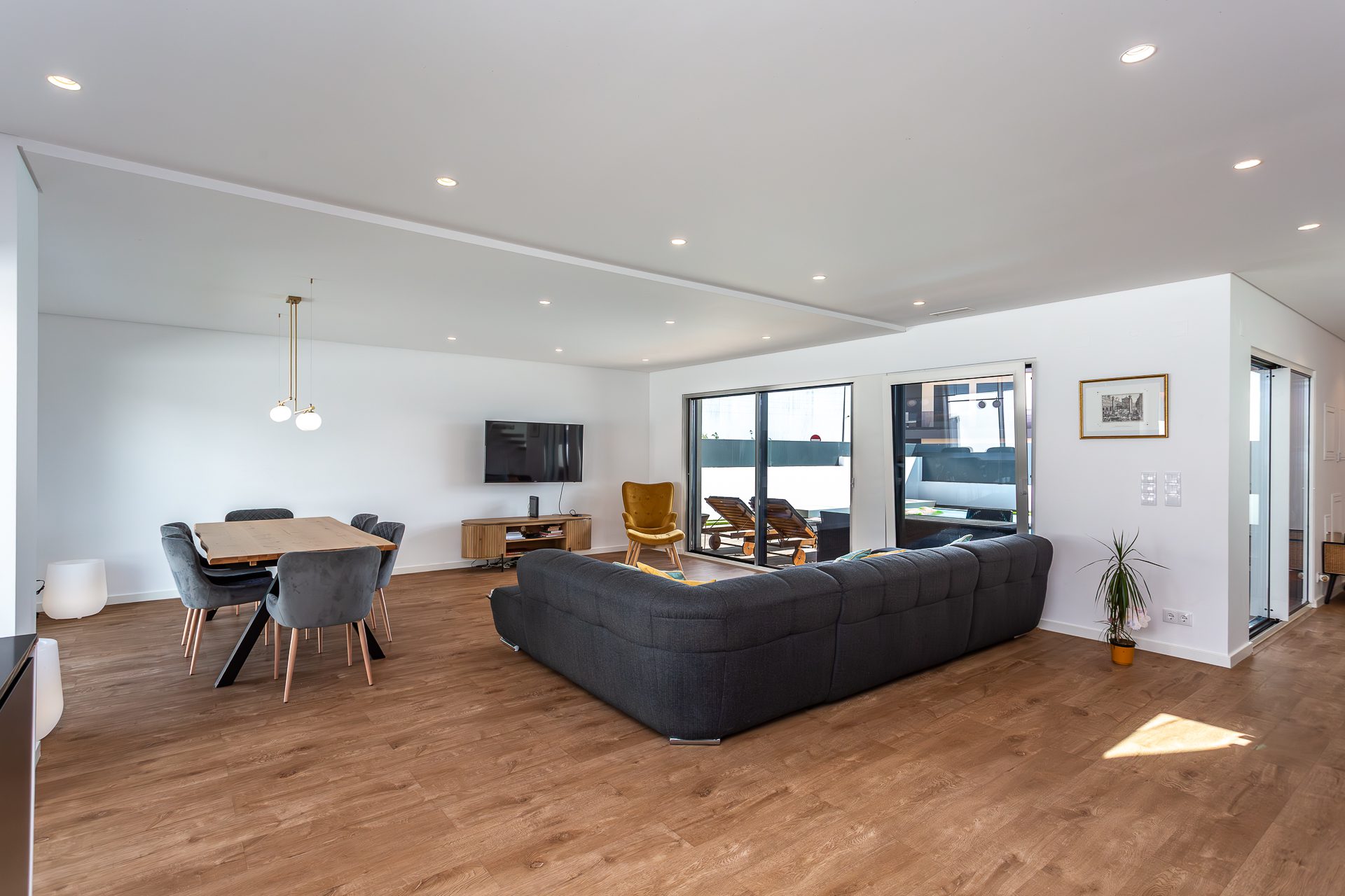 No rés-do-chão, um hall acolhedor dá acesso a uma ampla sala em open space com áreas bem definidas para estar e jantar. A luz natural entra generosamente pelas grandes janelas, que fazem a ligação direta ao terraço e à piscina. A cozinha, totalmente equipada com eletrodomésticos topo de gama, destaca-se pela funcionalidade e pelo design discreto e elegante.