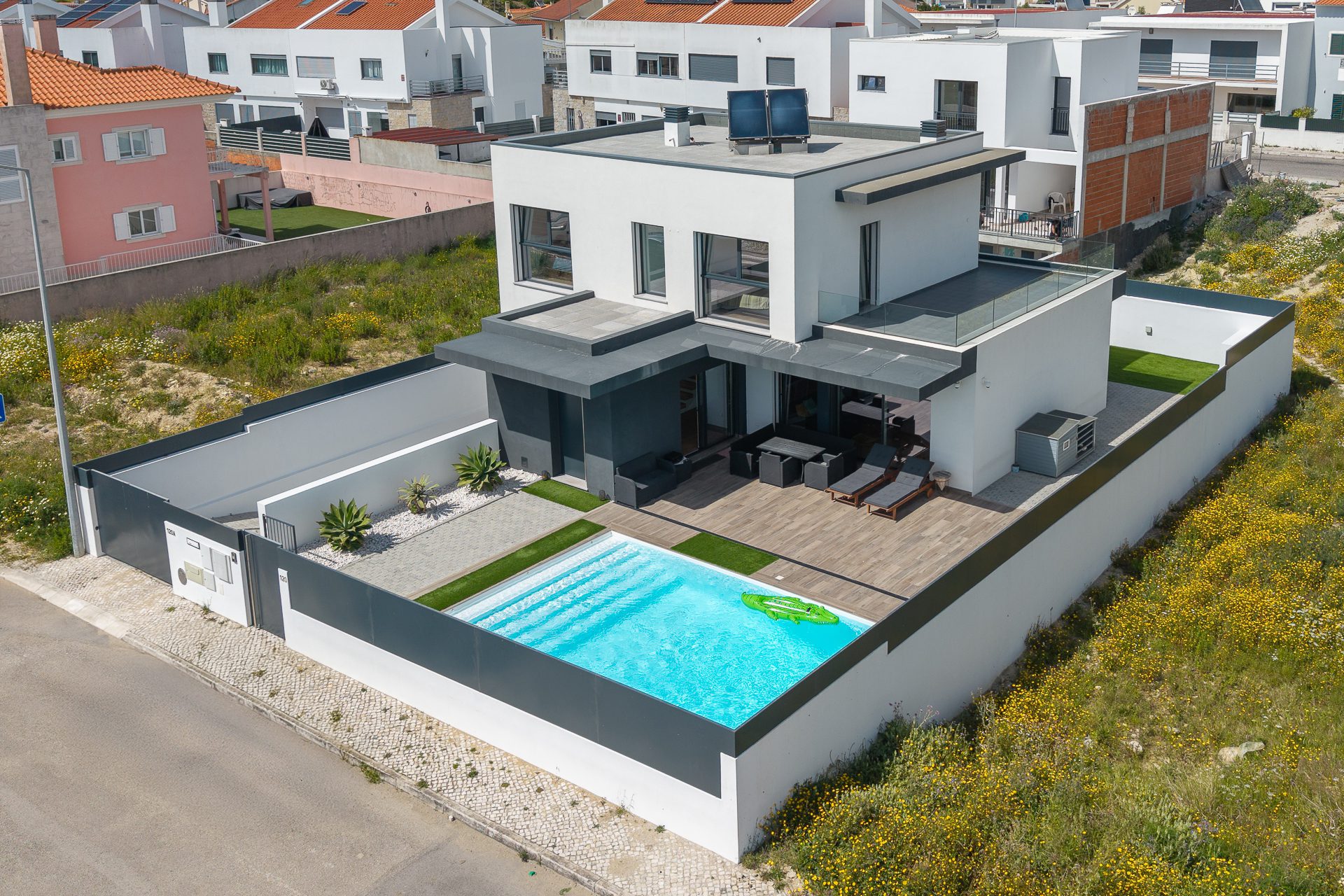 O terraço com deck, piscina de água cristalina e jardim de baixa manutenção criam um ambiente ideal para momentos de lazer ao ar livre. Há ainda uma zona coberta para refeições, perfeita para partilhar com família ou amigos.