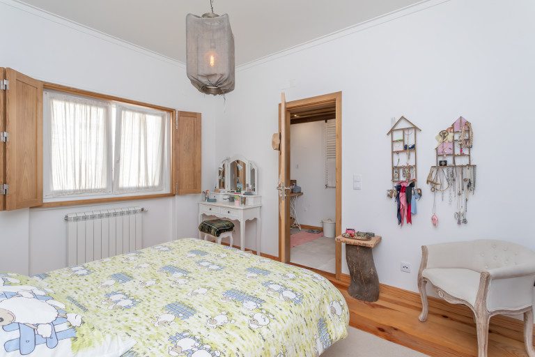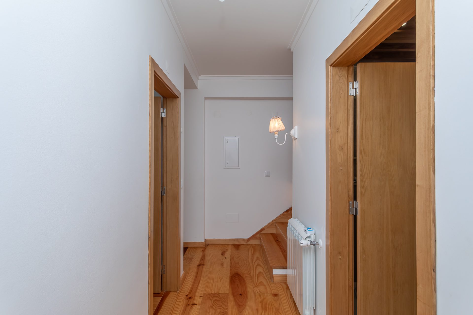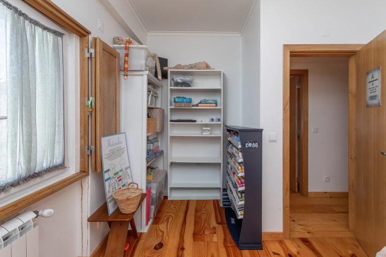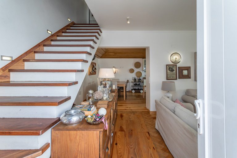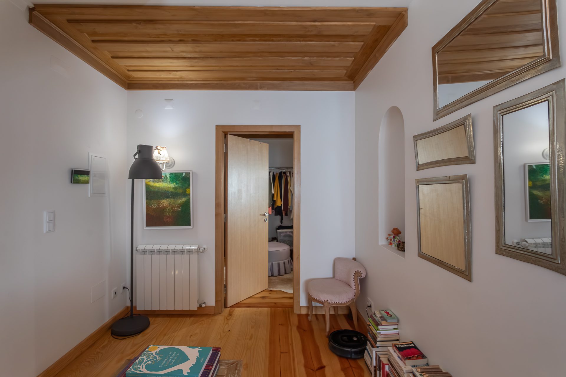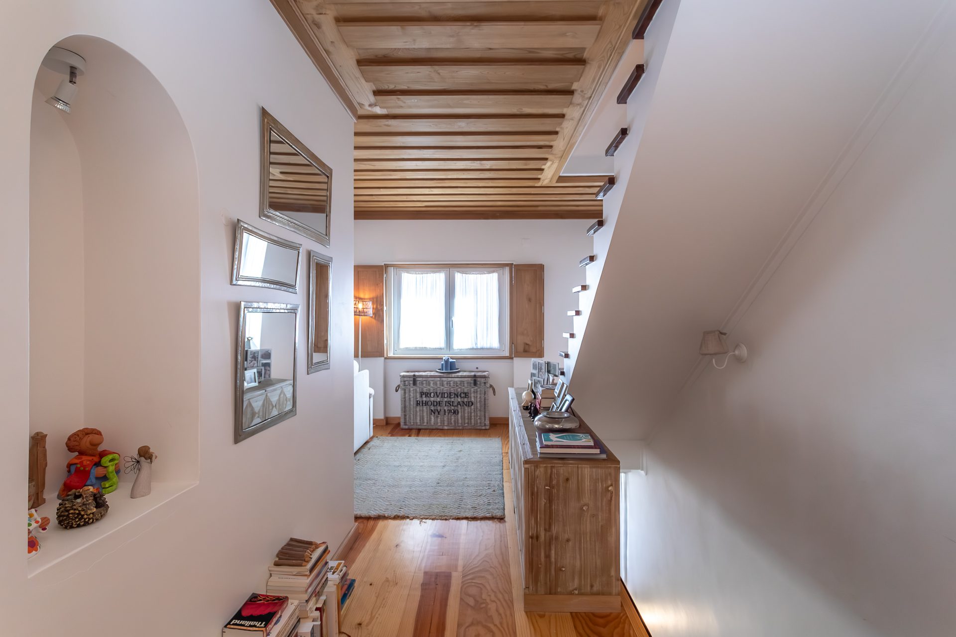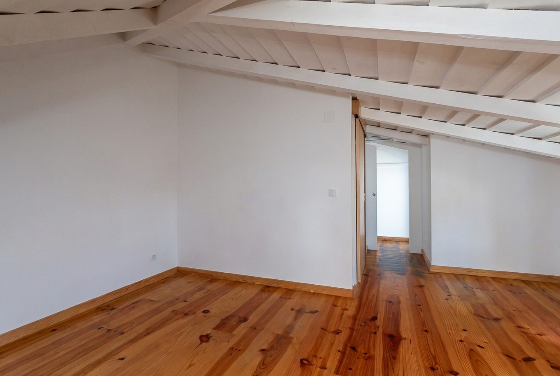 Os pavimentos em madeira de tom natural percorrem toda a casa, trazendo calor e continuidade aos espaços. Tetos altos trabalhados com molduras decorativas evocam a elegância clássica lisboeta, enquanto a mansarda revela vigas de madeira expostas que acrescentam personalidade e autenticidade às zonas mais privadas da moradia.
