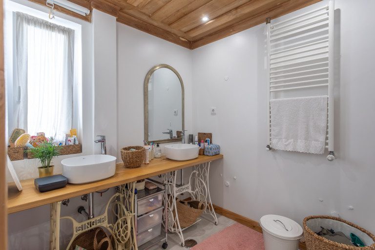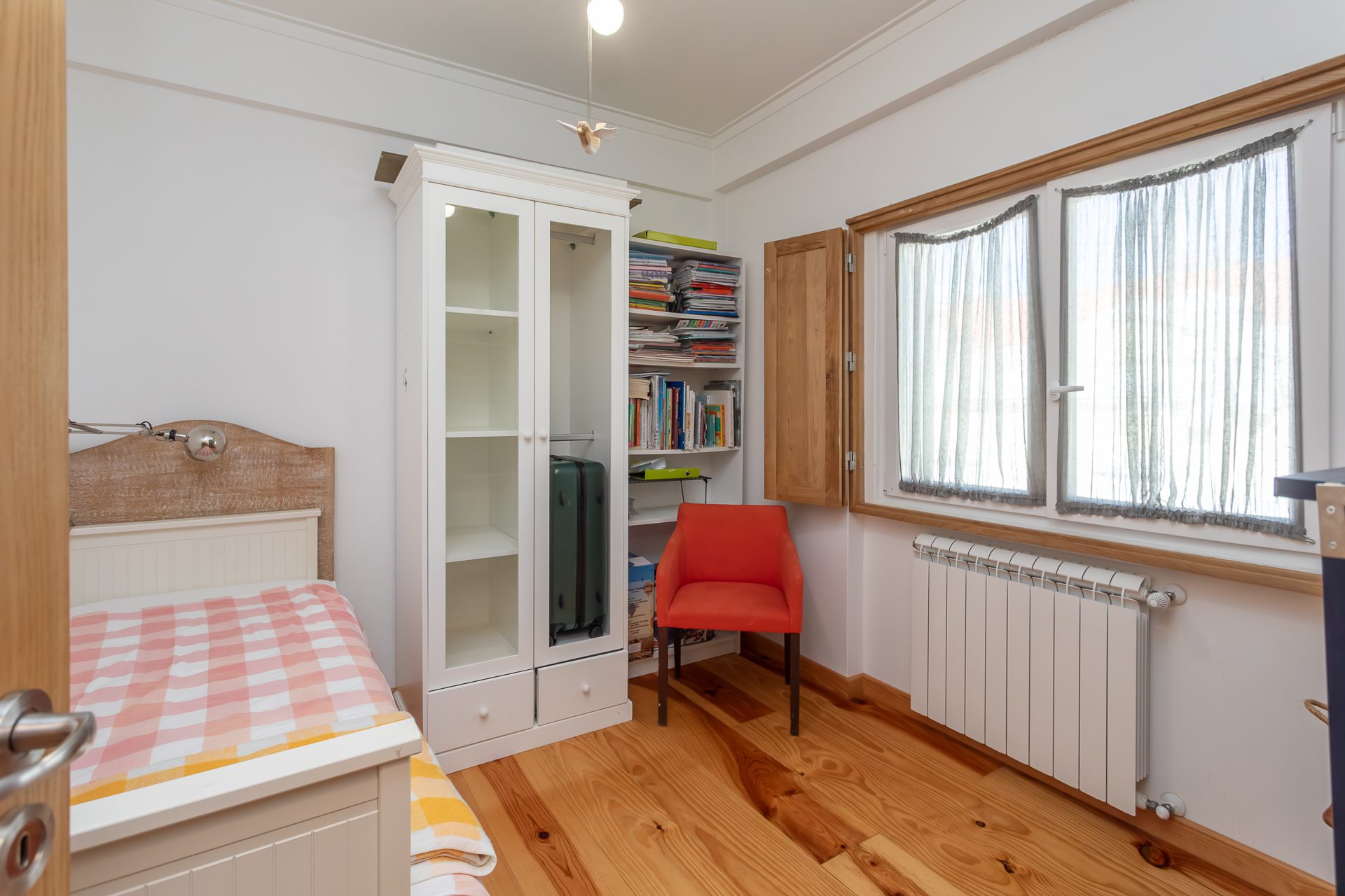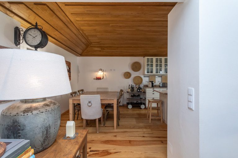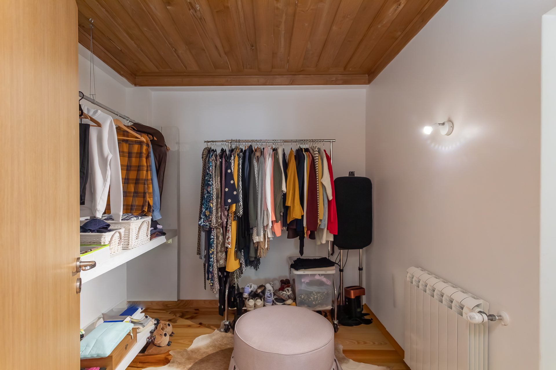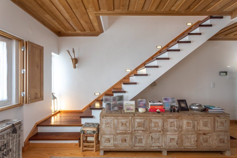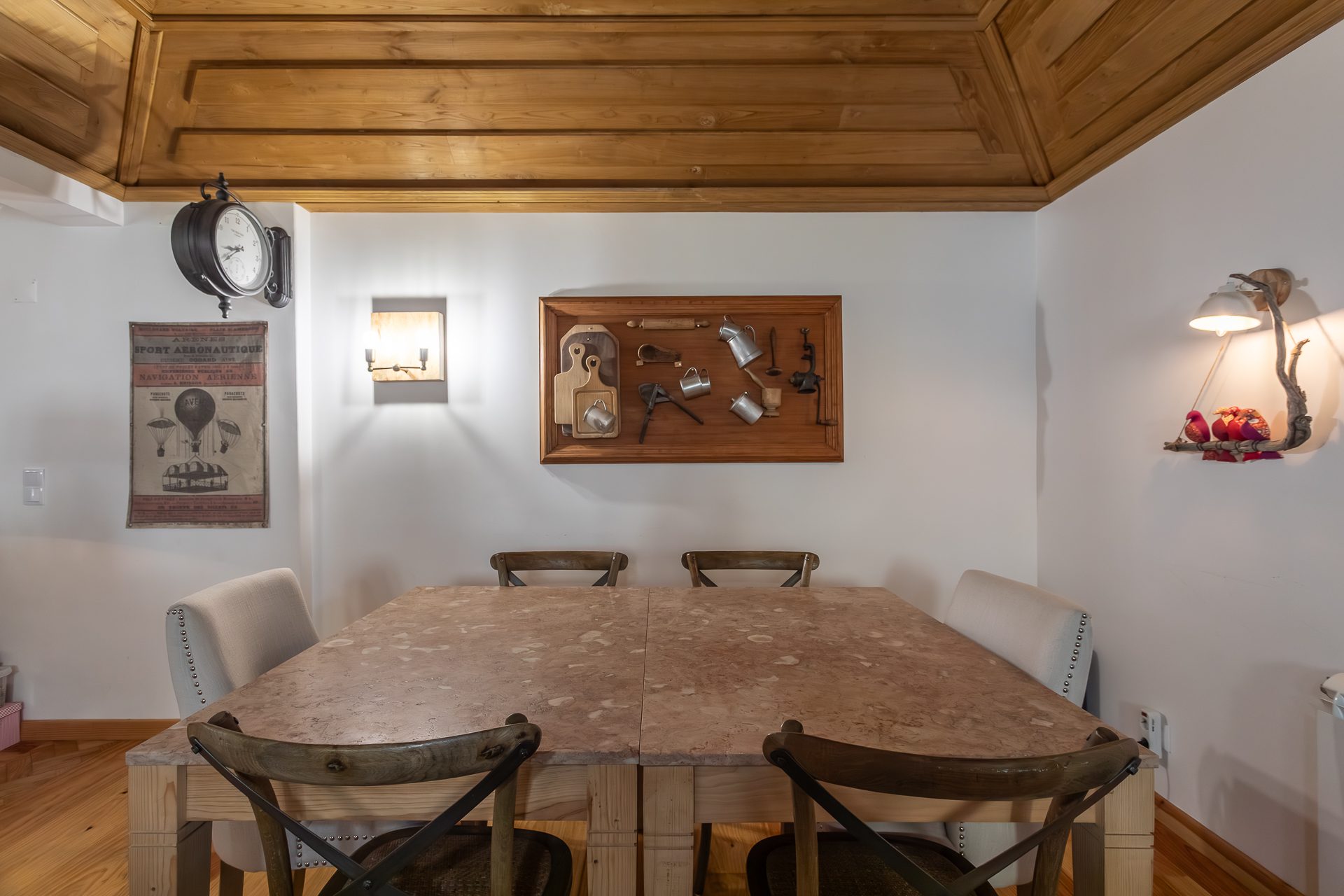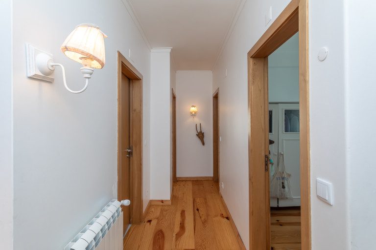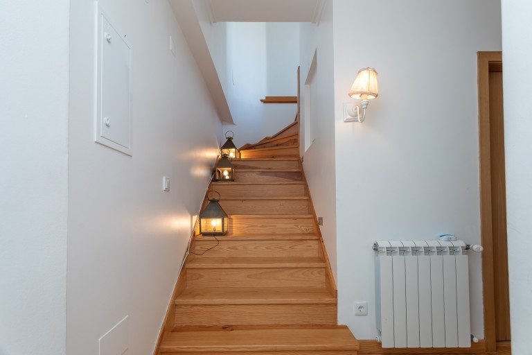 Os pavimentos em madeira de tom natural percorrem toda a casa, trazendo calor e continuidade aos espaços. Tetos altos trabalhados com molduras decorativas evocam a elegância clássica lisboeta, enquanto a mansarda revela vigas de madeira expostas que acrescentam personalidade e autenticidade às zonas mais privadas da moradia.