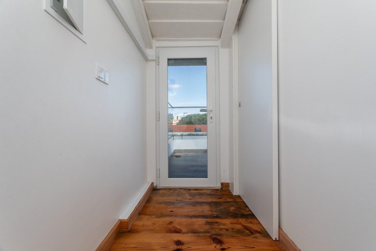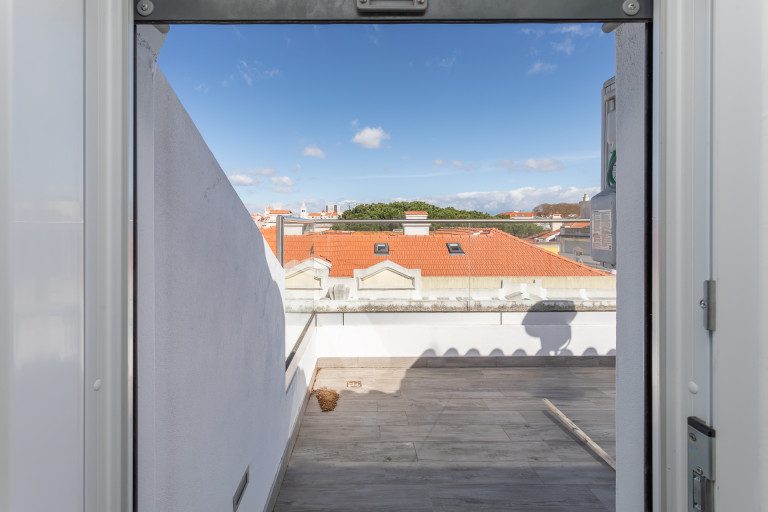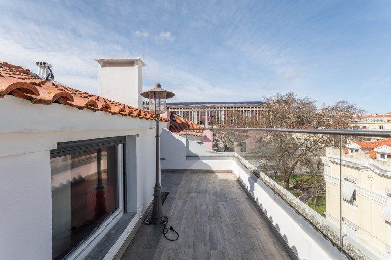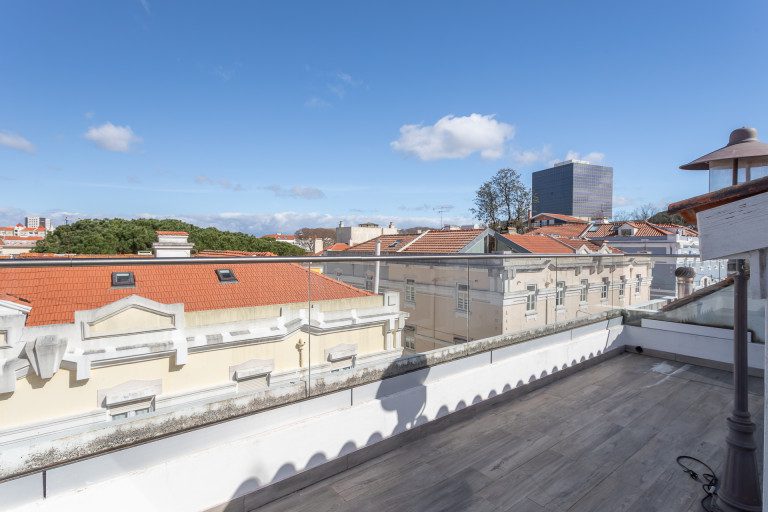 No último piso, a casa revela o seu momento mais especial: um terraço panorâmico em deck de madeira, com uma vista aberta sobre os telhados históricos da cidade. Um espaço raro em Lisboa — perfeito para jantares ao pôr-do-sol, momentos de pausa ou simplesmente para contemplar a cidade.